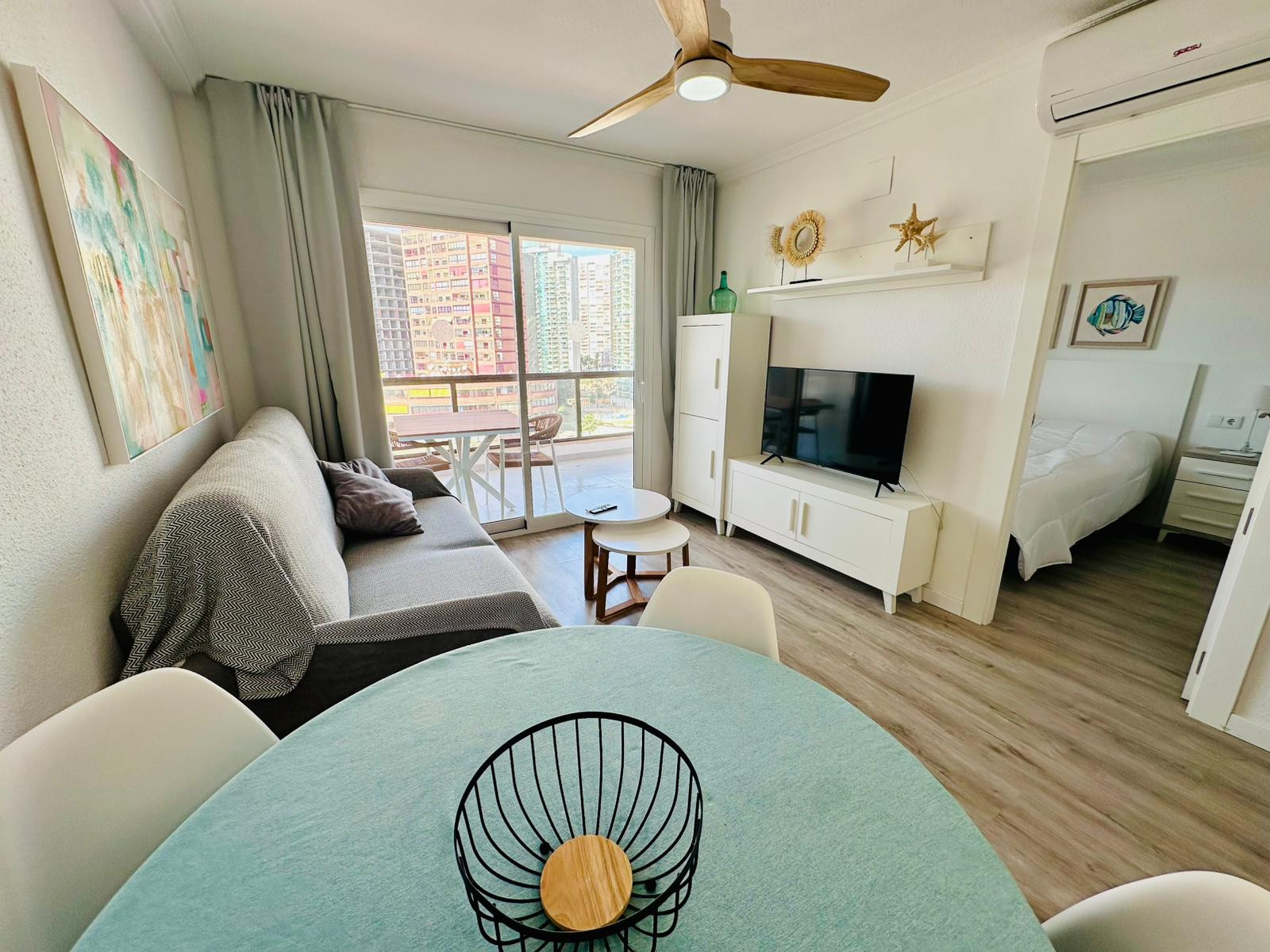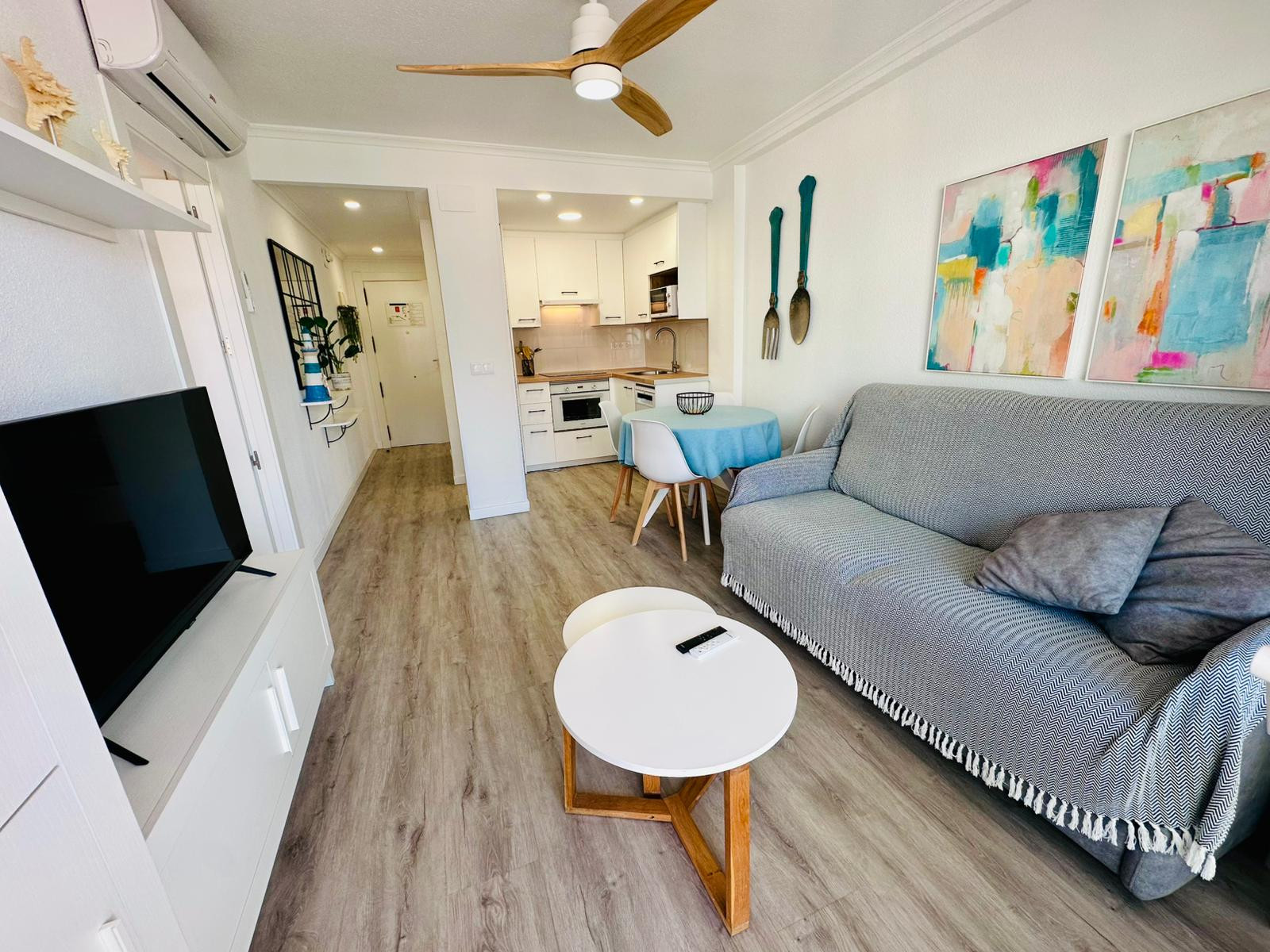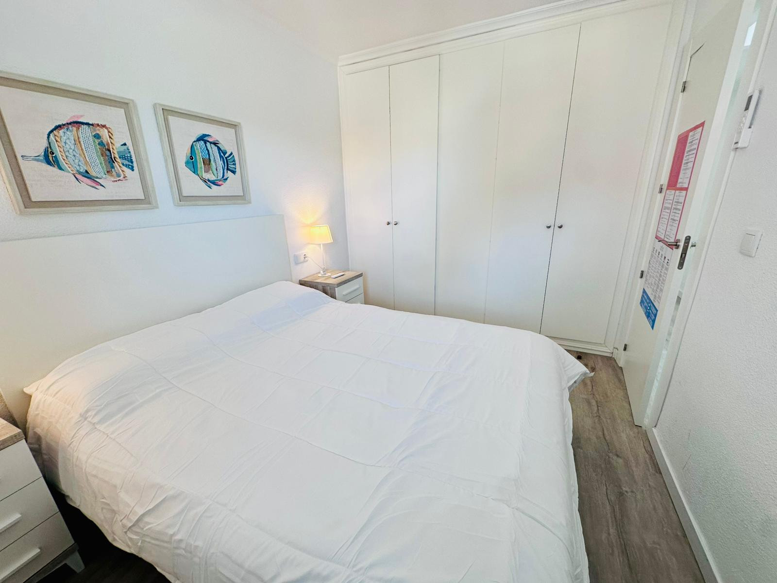 El apartamento cuenta con una habitación principal con una cama doble y un sofá-cama adicional, ideal para familias pequeñas o grupos reducidos. La distribución espaciosa incluye un baño moderno con ducha, perfecto para refrescarse después de un día de playa. La cocina está totalmente equipada con electrodomésticos modernos como nevera, lavadora, lavavajillas, microondas, horno, cafetera, tostadora, hervidor y exprimidor, permitiendo preparar comidas deliciosas con facilidad.